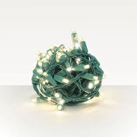 5 mm Wide Angle Conical – 70 Bulb Count, 4″ Spacing – 2600K Warm White – Green Wire – Balled