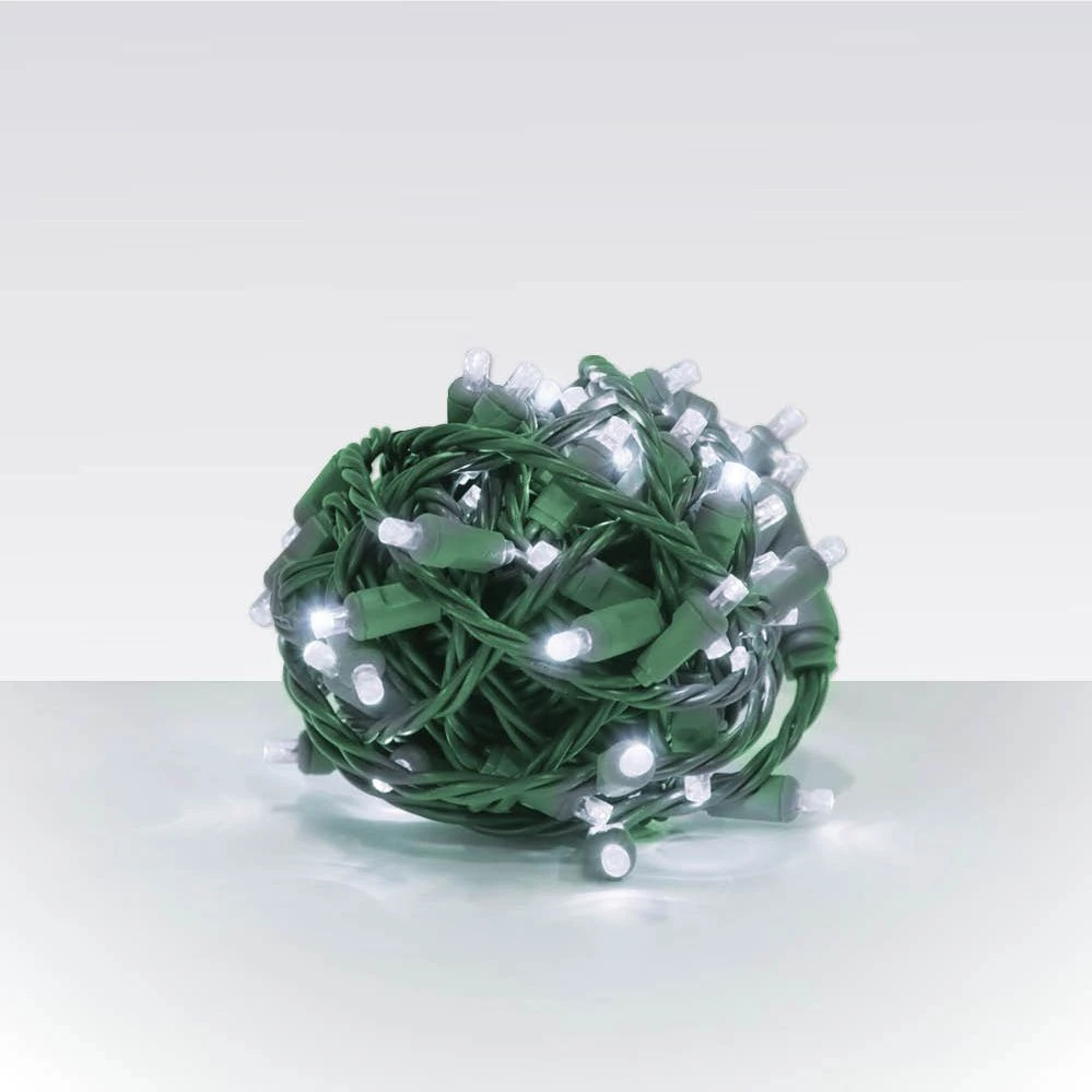 5 mm Wide Angle Conical – 70 Bulb Count, 4″ Spacing – 4600K Pure White – Green Wire – Balled